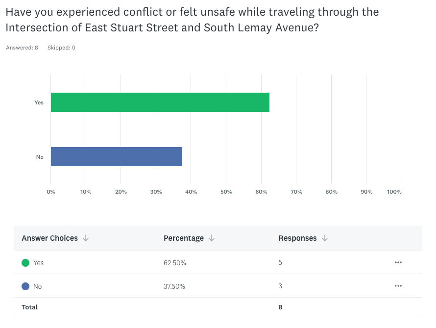 - “High rate of speed of cars turning from Stuart to Lemay (trying to make the light) without time to see bikes or pedestrians. Traveling eastbound, cars taking the turn lane into the Ridgeview school regularly cut off bikes in the turn lane. Cars drive far too fast on Stuart as a whole (the entire segment between College and Lemay); it needs several stoplights and calming. Traffic on Lemay is very aggressive.“