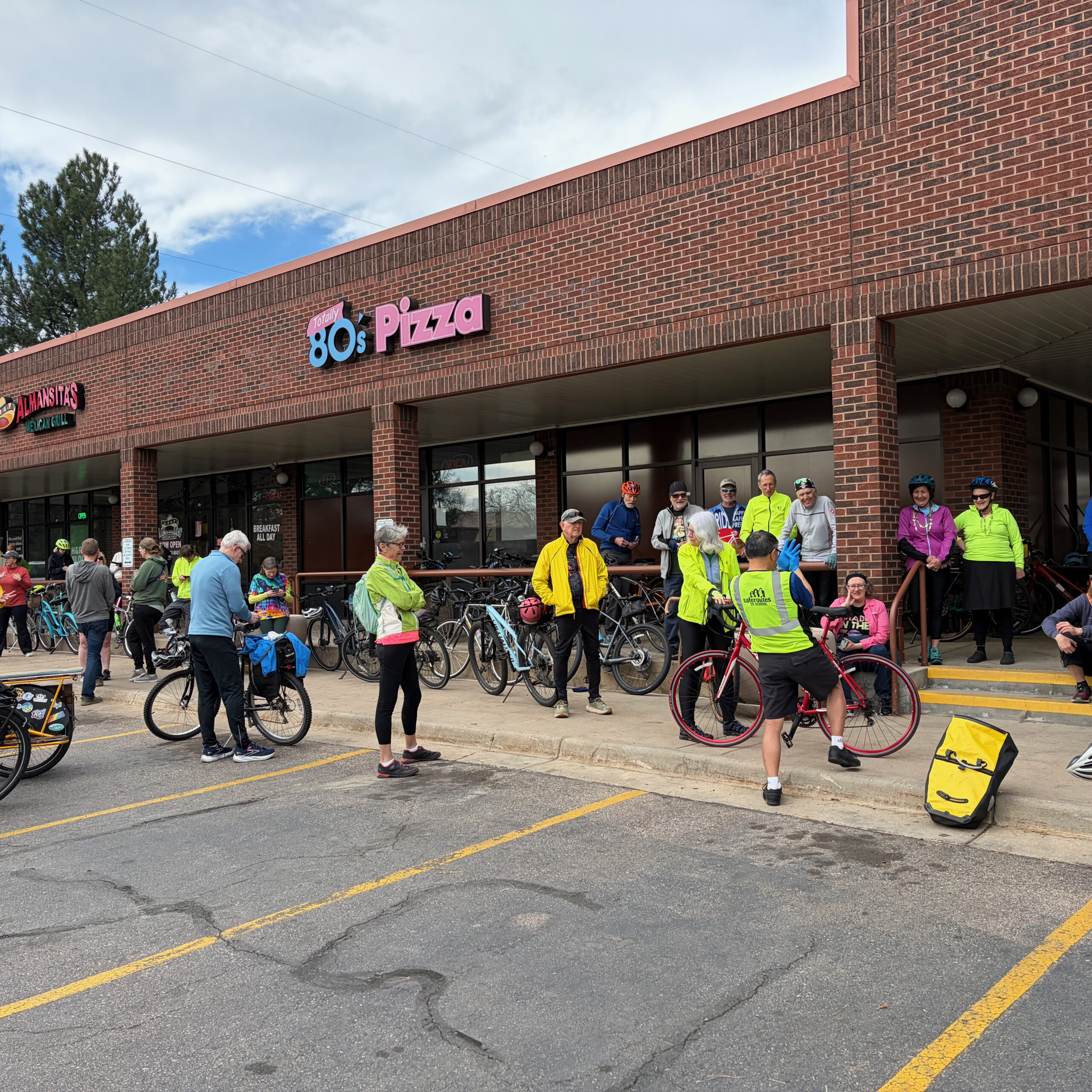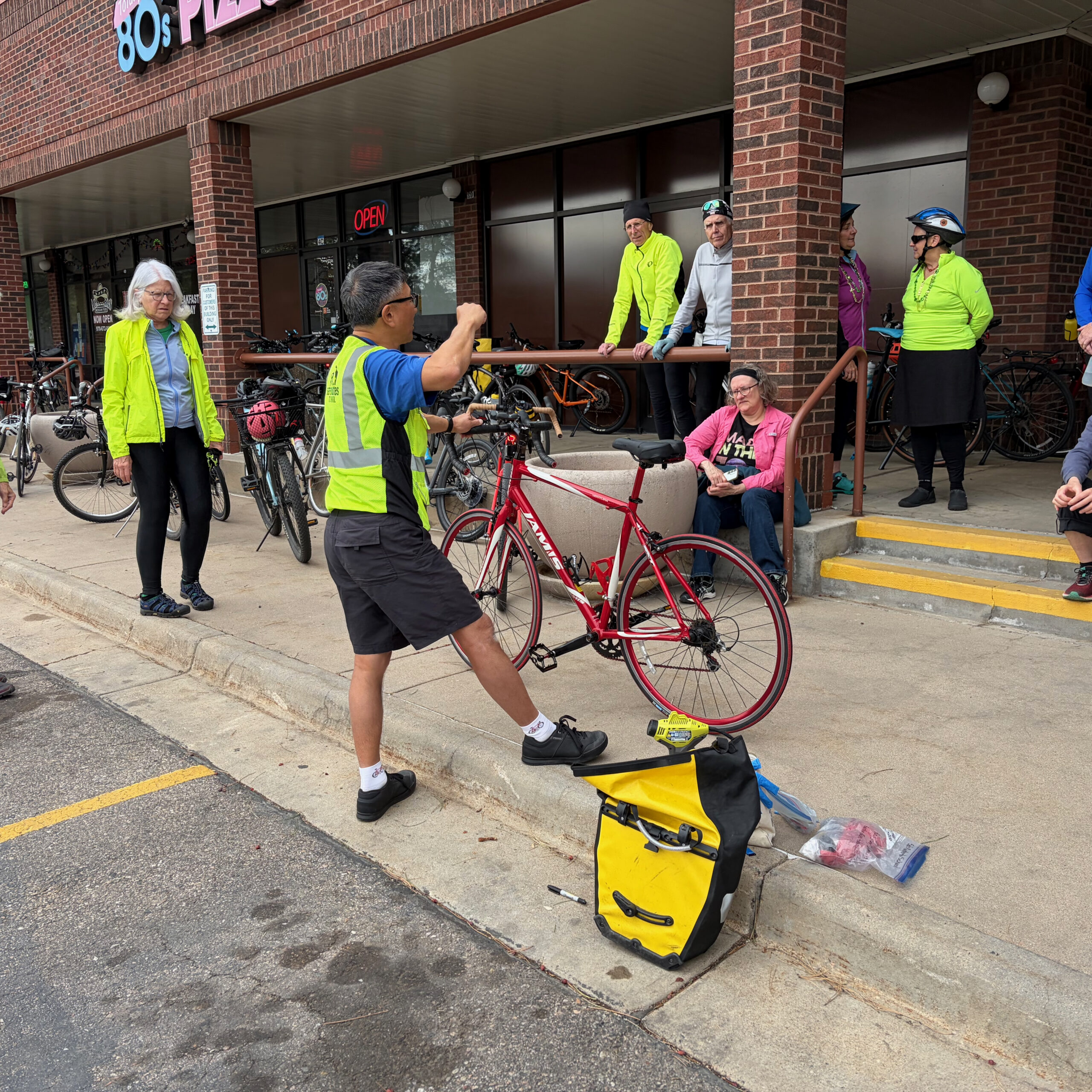 Fueled up and feeling good, the group cruised another 3.5 miles along Fort Collins’ low-stress bike routes before pulling up to Totally 80’s Pizza & Museum. This spot is as fun as it sounds—wall-to-wall 80’s nostalgia, arcade vibes, and the smell of fresh pizza in the air. Riders had to make yet another big decision: classic pepperoni or cheese slices (arguably the hardest choice of the day). And just when we thought it couldn’t get more rad, our resident Safe Routes to School Instructional Coordinator, Tim Han, jumped in with a quick roadside flat repair demo—keeping things rolling and proving that even in the middle of an 80’s pizza party, you can still pick up some pro bike skills.